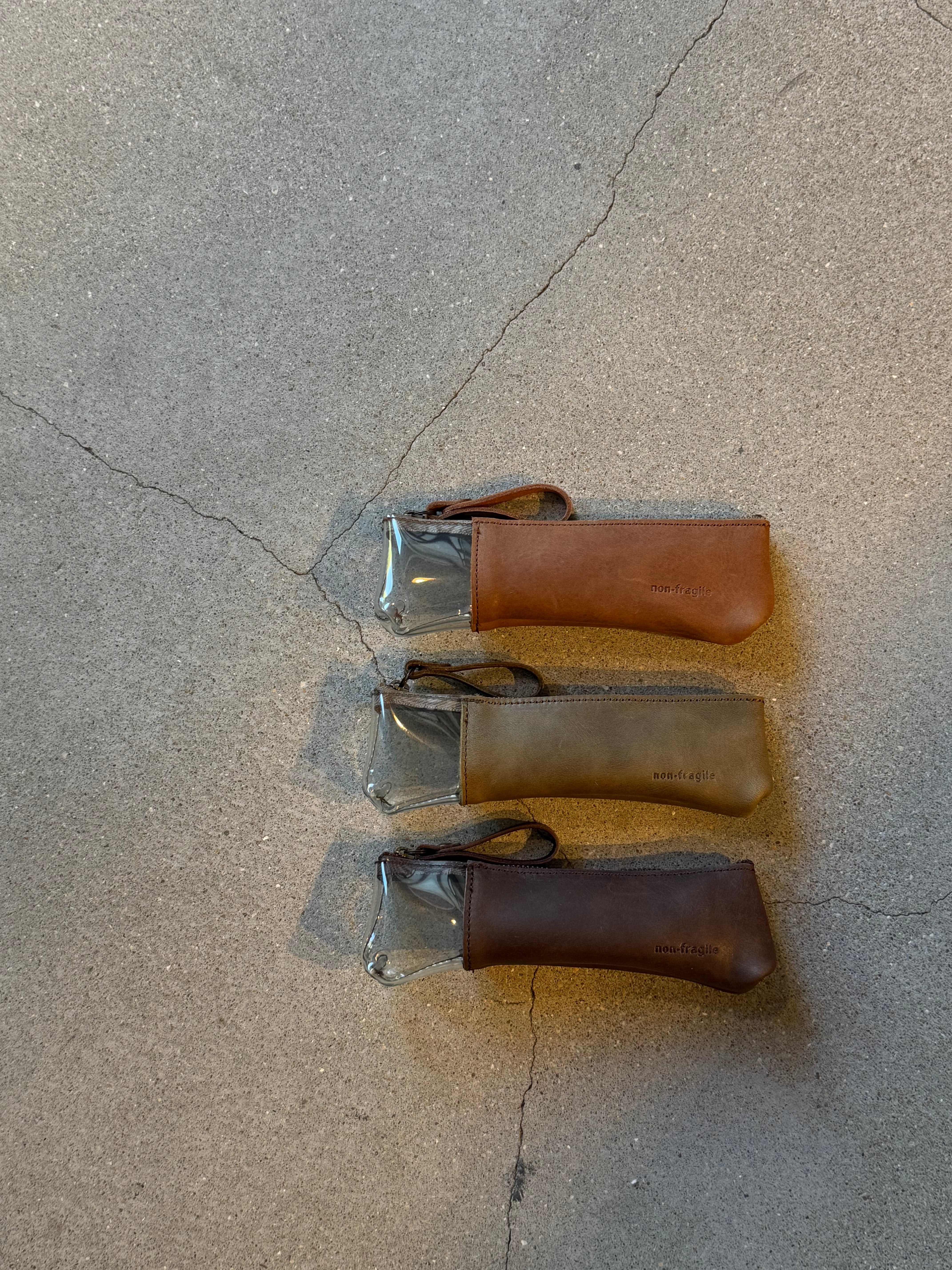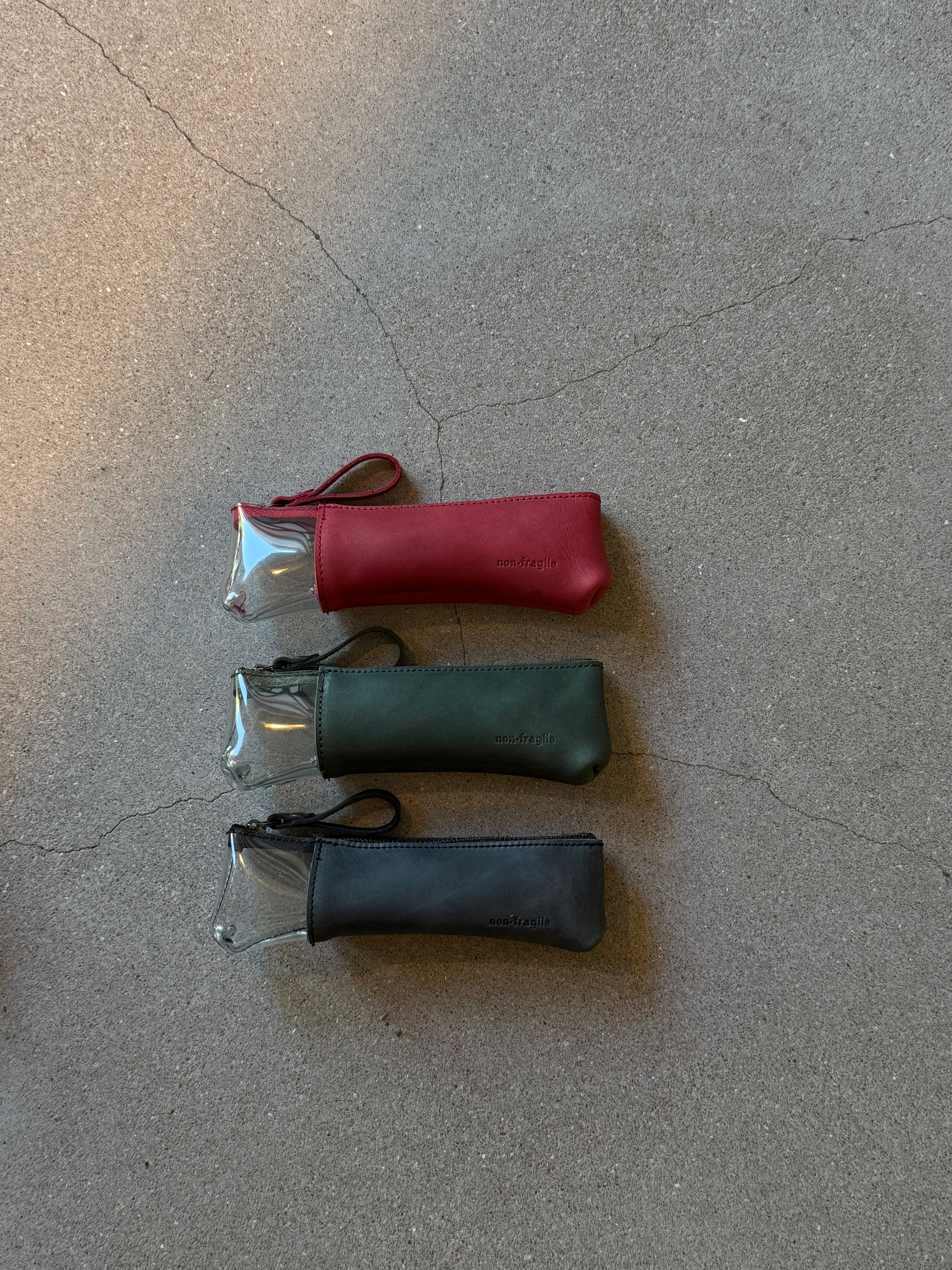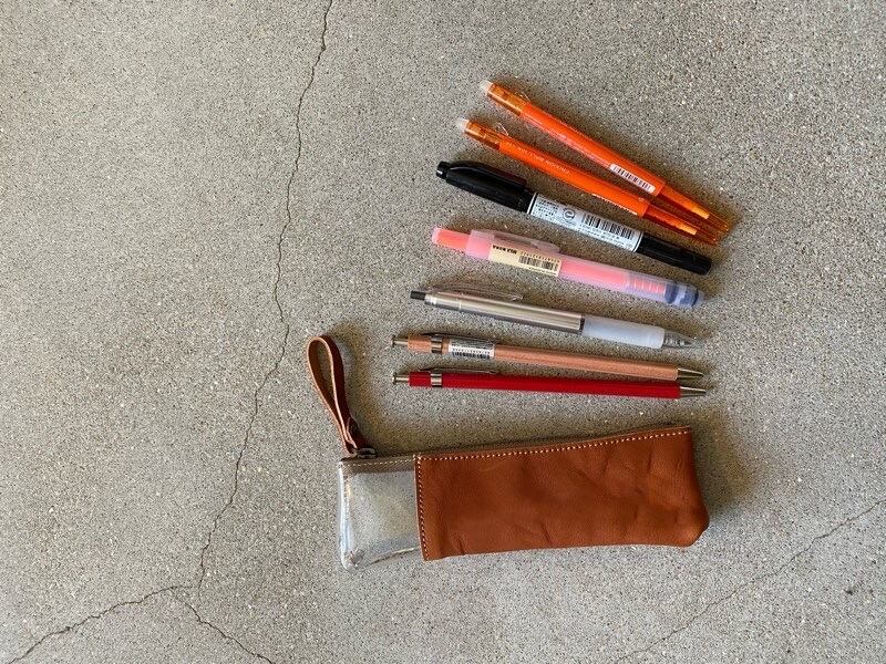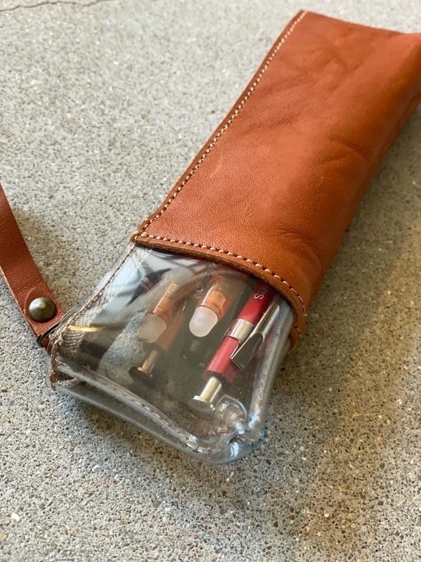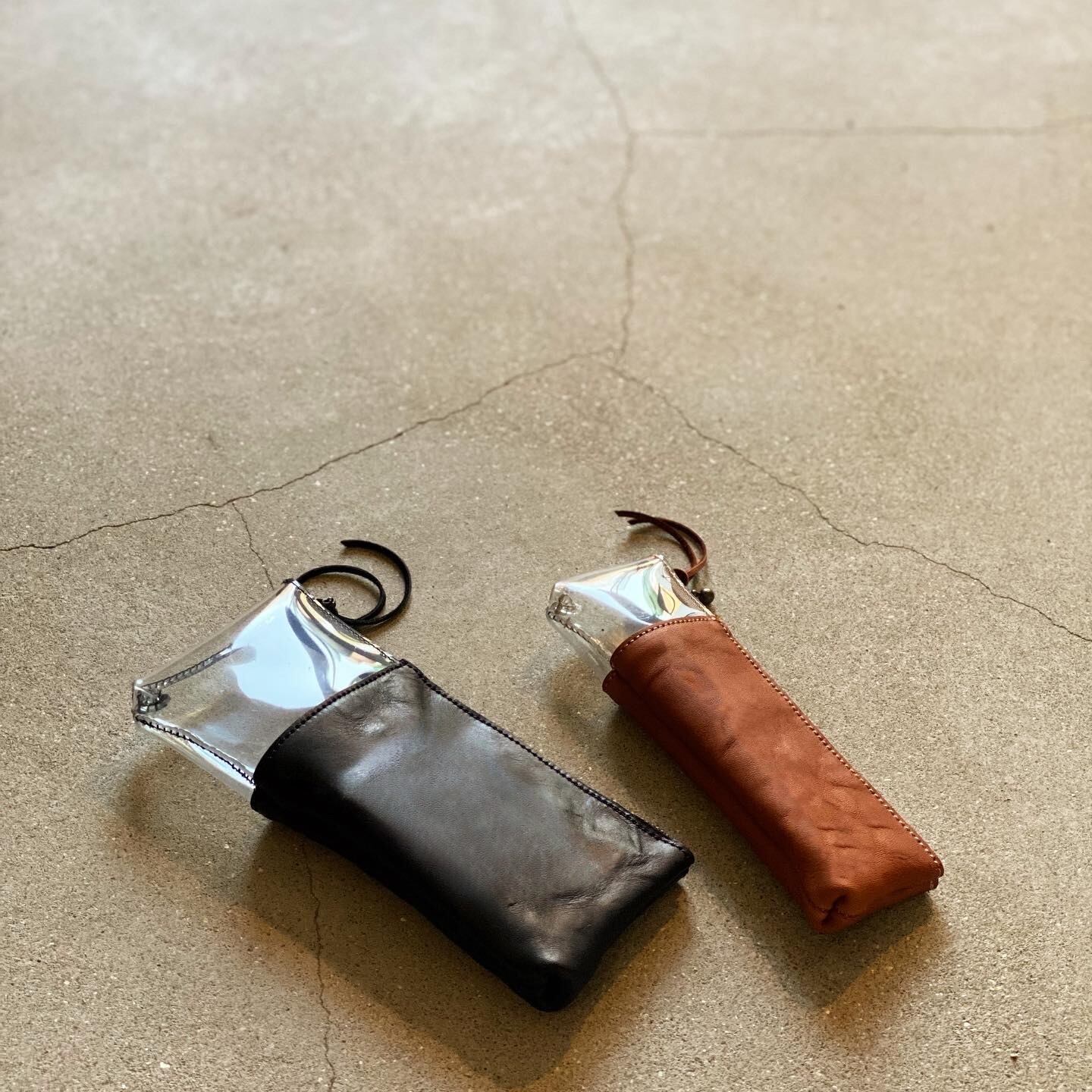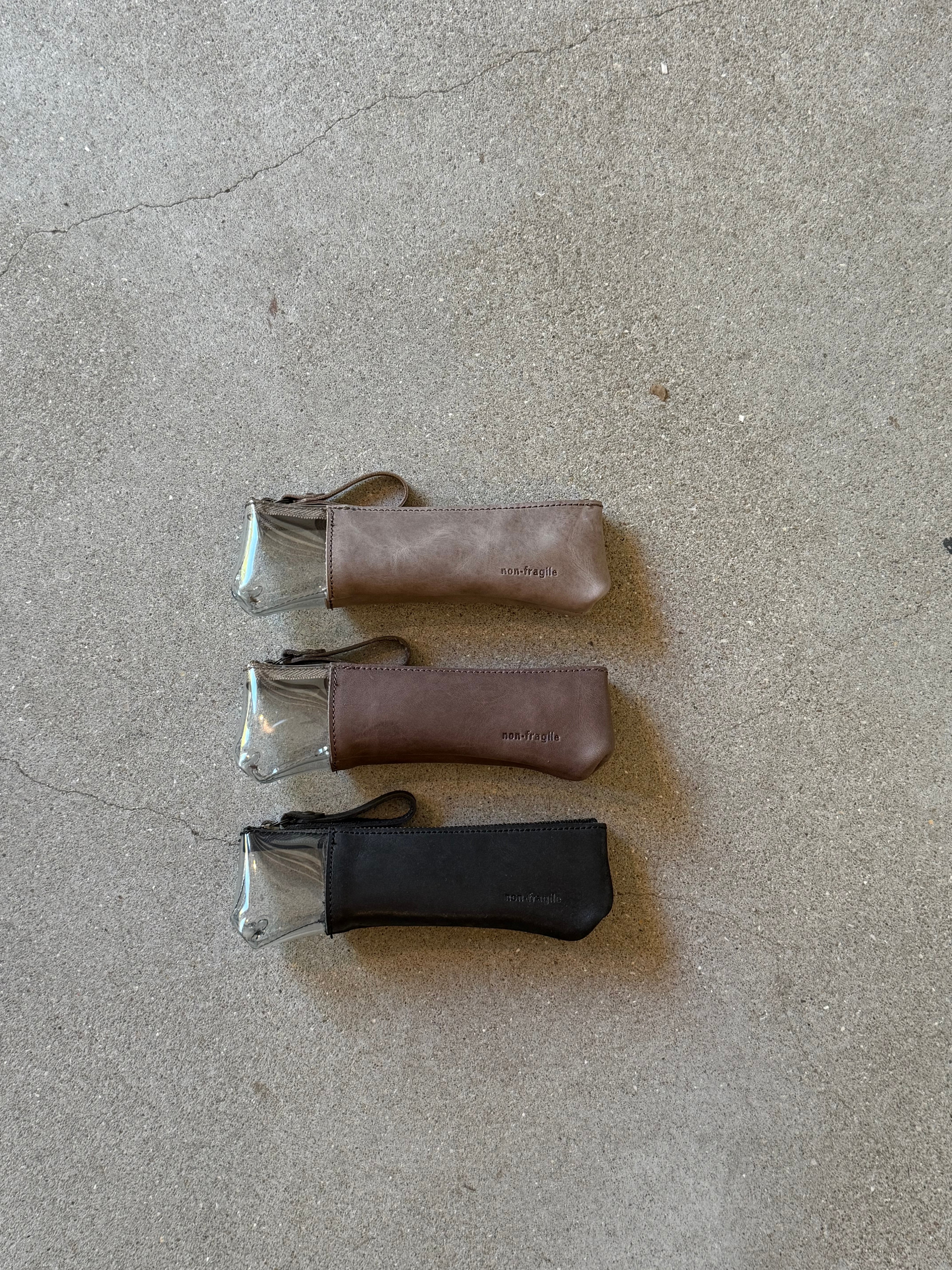 革と透明PVCを組み合わせた、異素材のペンケース。
