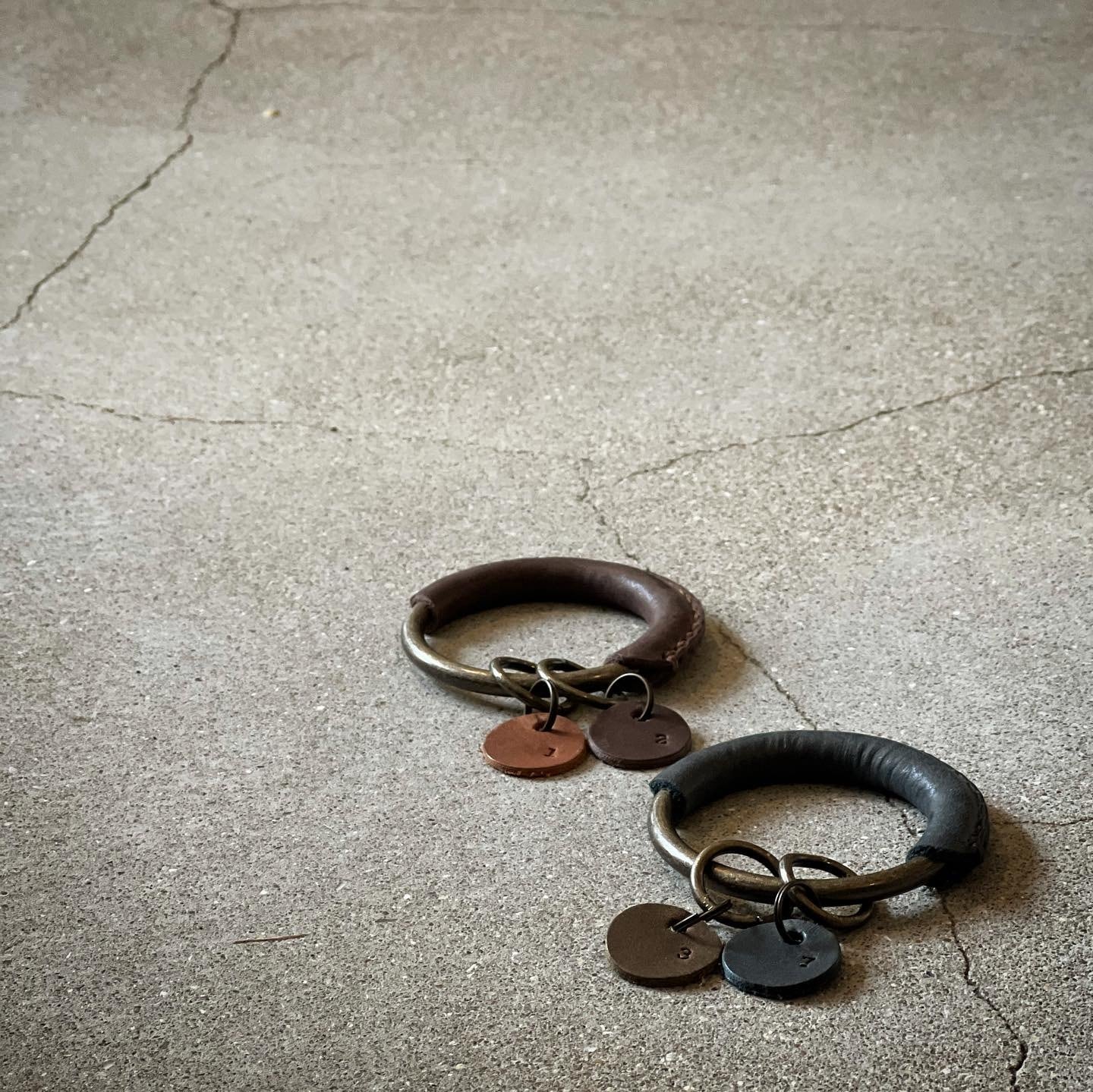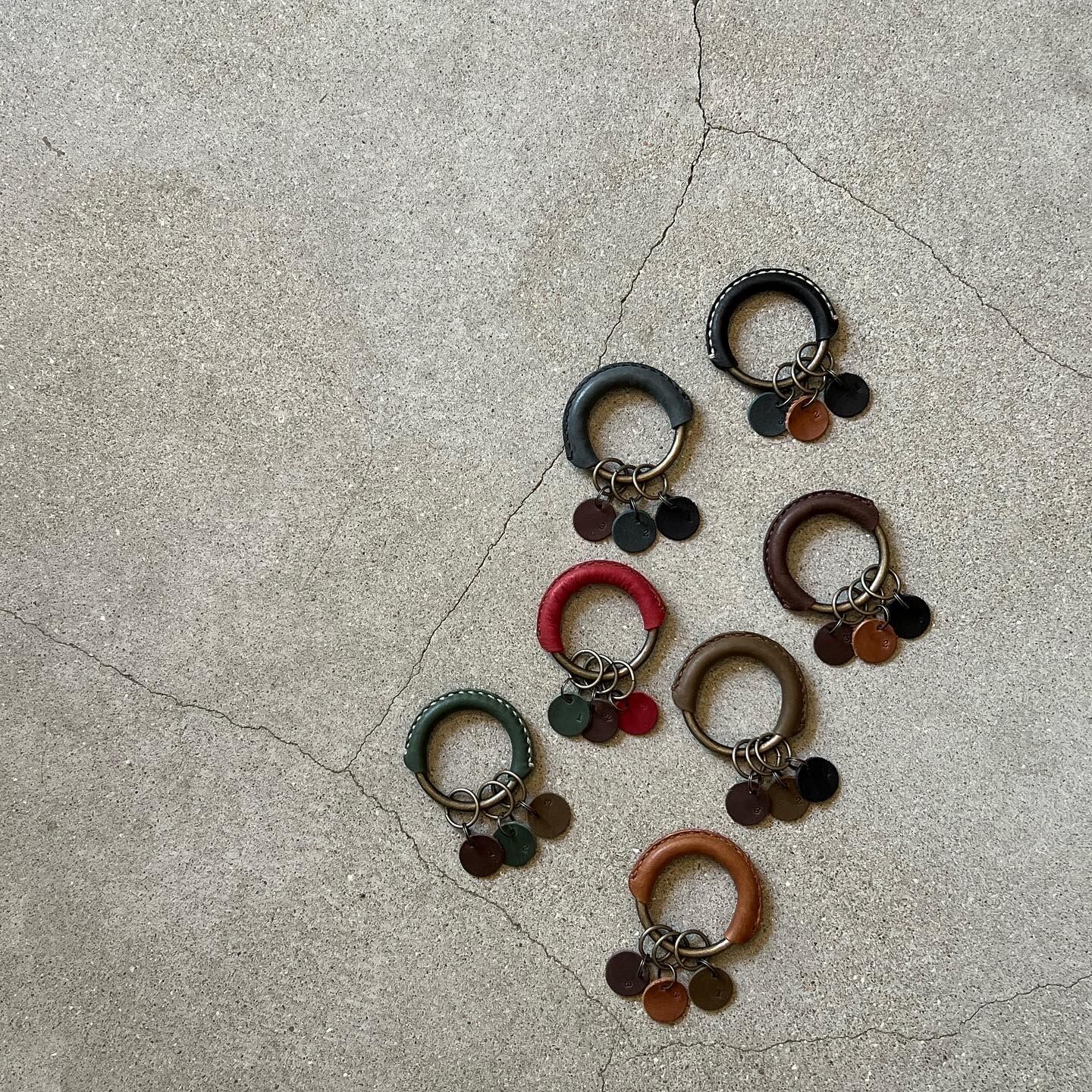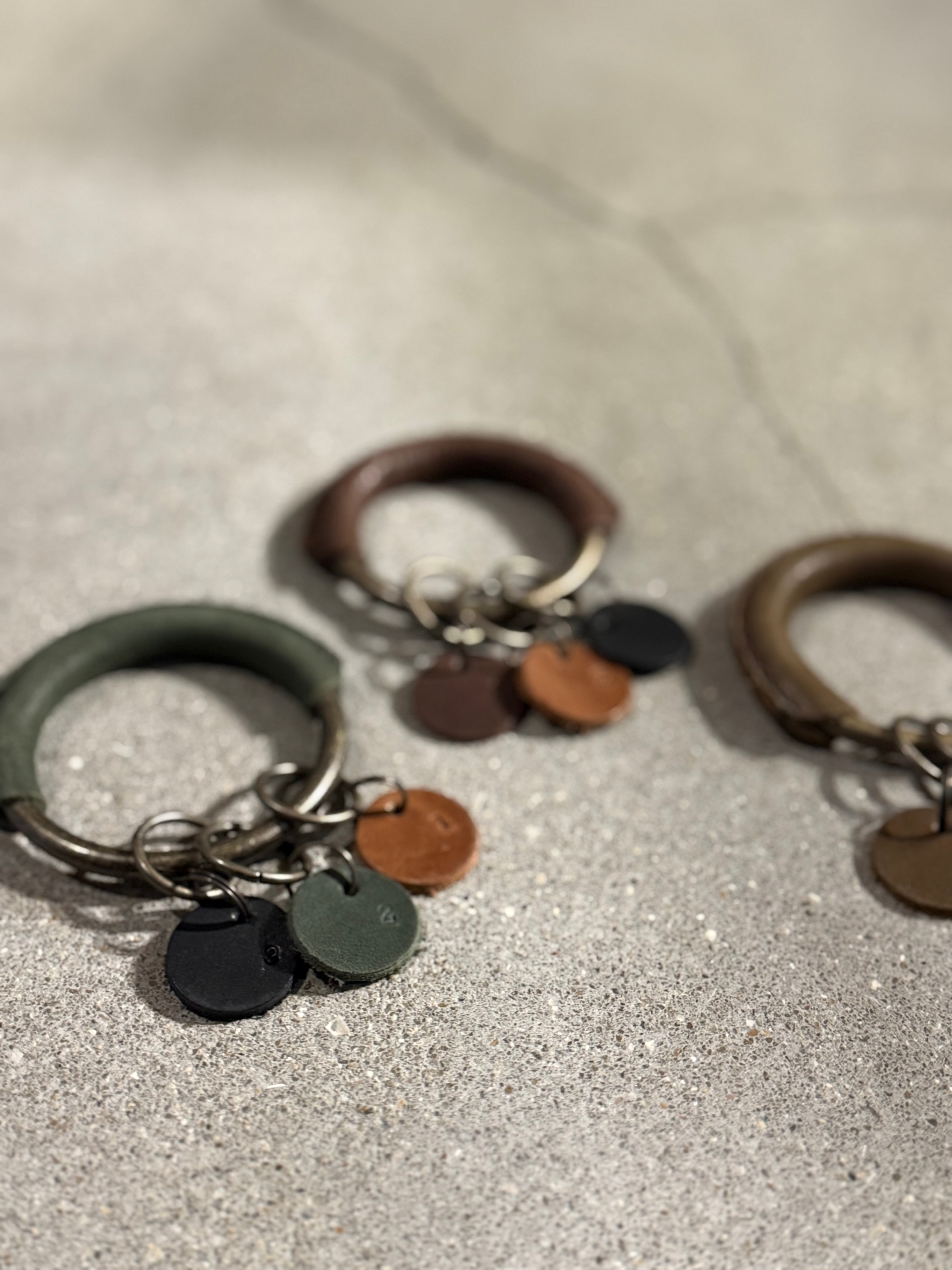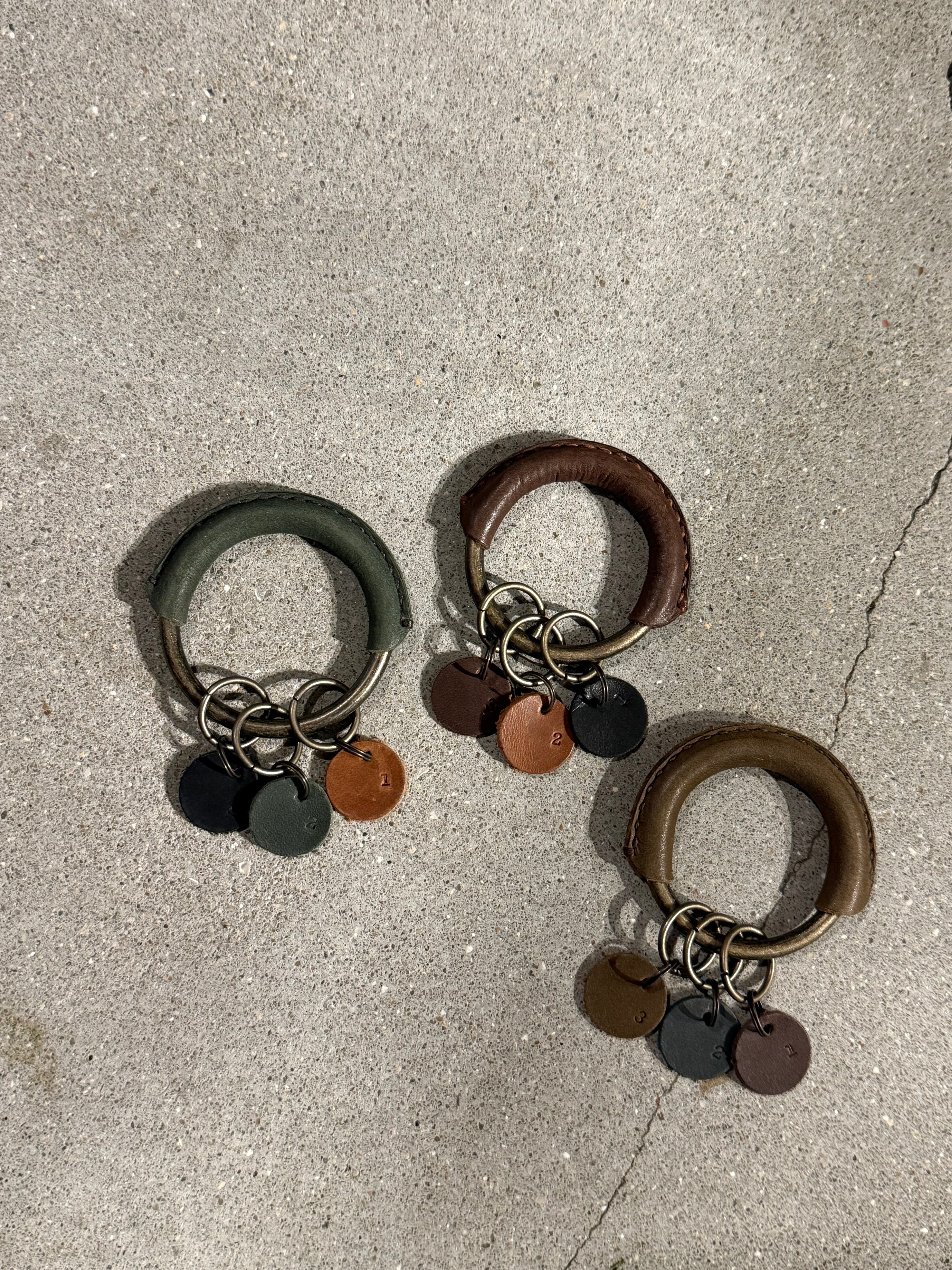 外径6cmのリングに革を巻き、手縫いで仕立てたキーホルダー。