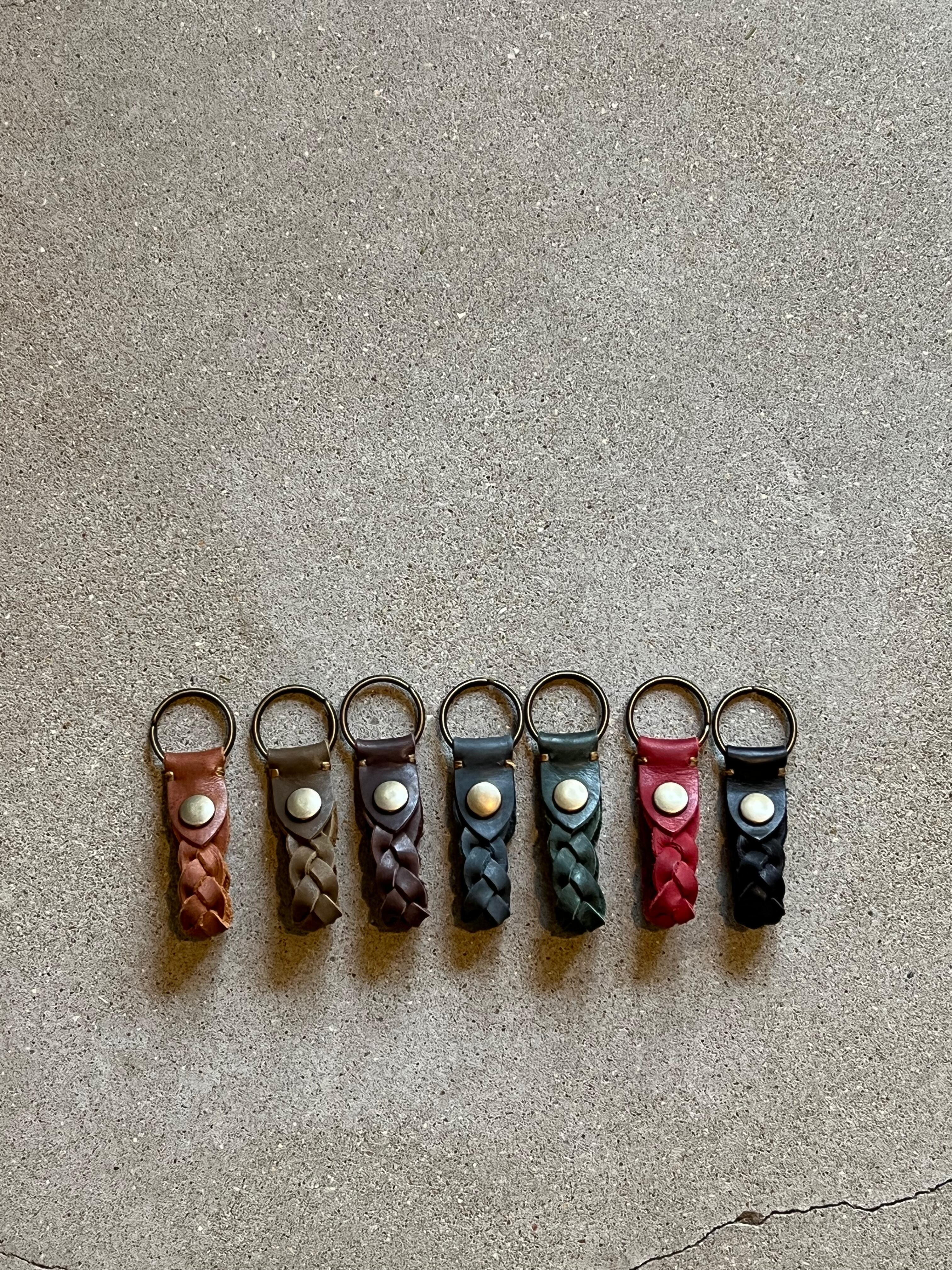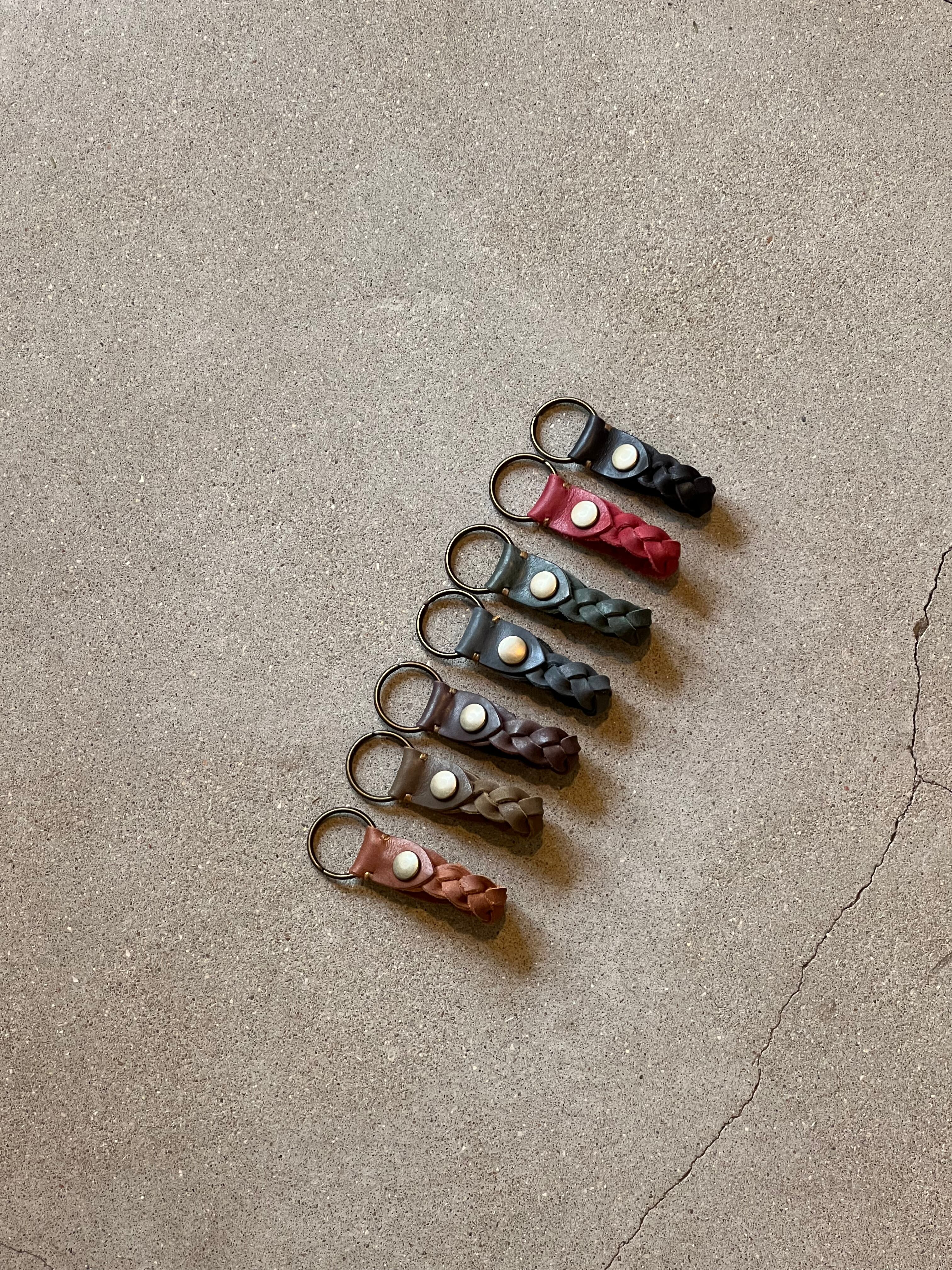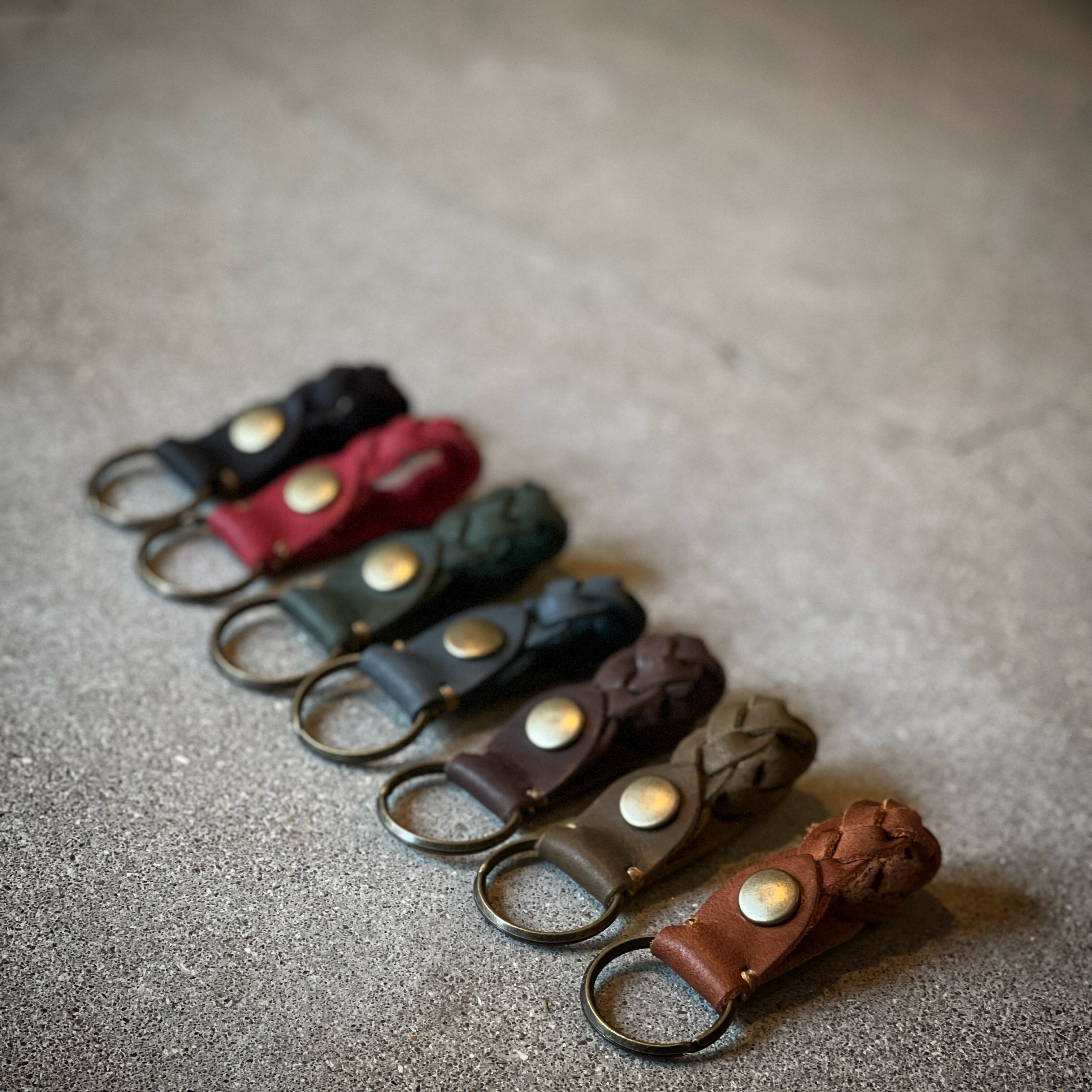三つ編みの革がさりげないアクセントになるキーホルダー。